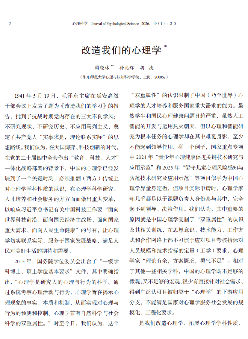 Journal of Psychological Science ›› 2026, Vol. 49 ›› Issue (1) : 2-5.